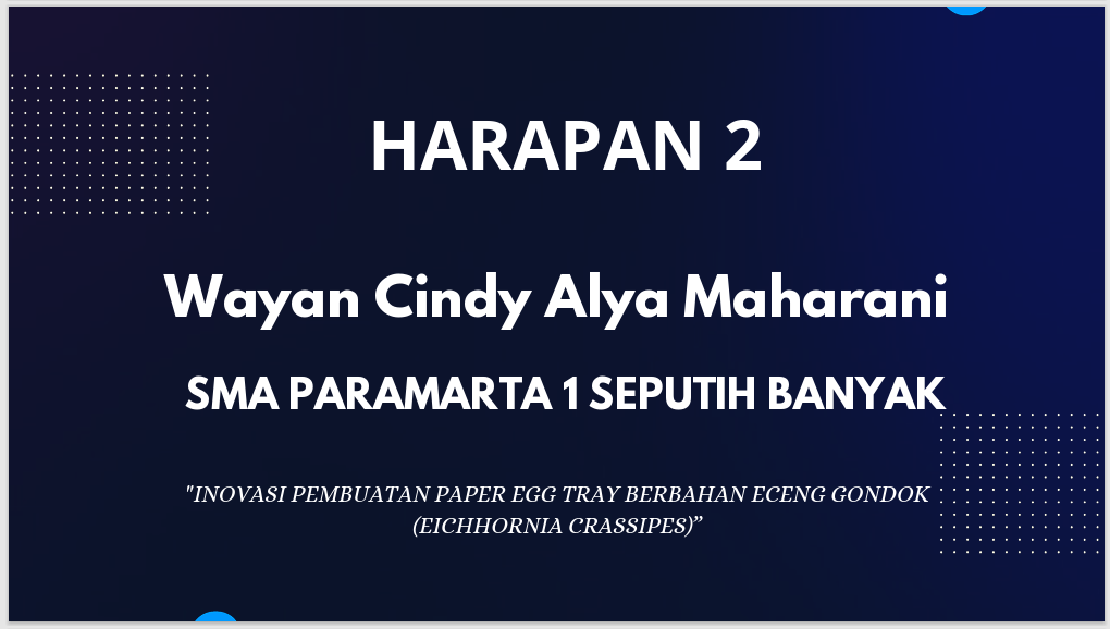 Karya Ilmiah yang berujudul "INOVASI PEMBUATAN PAPER EGG TRAY BERBAHAN ECENG GONDOK (EICHHORNIA CRASSIPES)" merupakan karya dari Wayan Cindy Alya, Albertus Dio dan Jihan Septika yang merupakan siswa/i SMA Paramarta 1 Seputih Banyak.